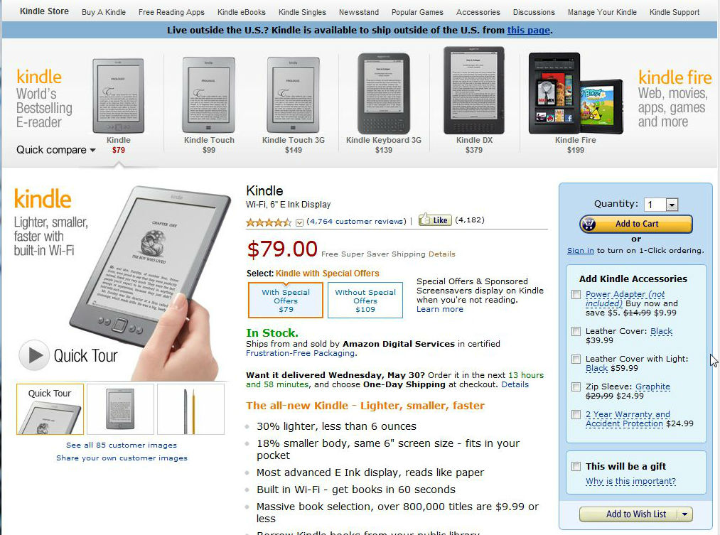 2012年5月現在、Kindleは第4世代目で、$79(広告スクリーンセーバー入り)~と大変安くなりました。 私のKindle3も『Kindle Keyboard』と名前を変えて継続中です。