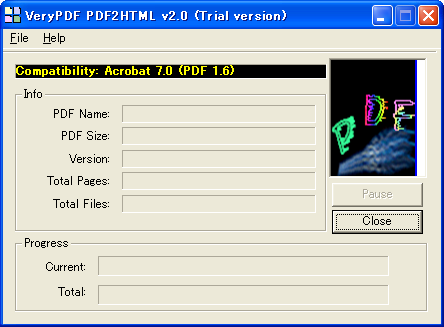 Acrobat7.0(PDF1.6)まで対応とありますが、当方ではう上手くいきません(Index.htmlが作成出来てない)でした。PDF1.4(Acrobat5.0)までなら比較的、作成に成功しました。