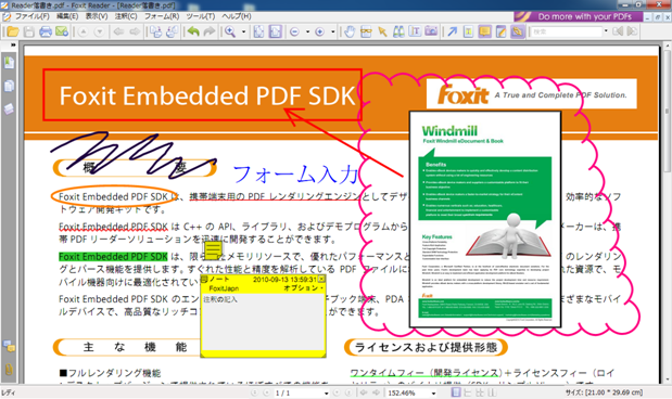 【コメントの貼付】 コメントツールを使えば、テキストメッセージや線、円、その他の図形を、PDF を閲覧しながらいつでも書き加えることができます。コメント形式のポップアップウィンドウには名前、コメント作成日時、書き加えたメッセージが表示されます。またコメントは編集、回答、消去、移動が簡単に行えます。