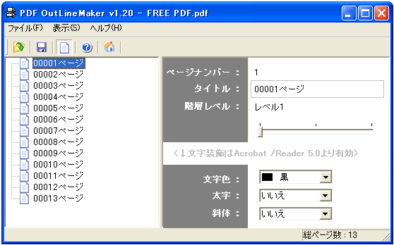 このソフトで、アクロバットがなくてもしおりを付加できまが、PDF1.2~1.4形式(Acrobat3.0-5.0相当)対応で、PDF1.5/1.6~と暗号化PDFには対応してませんので注意。