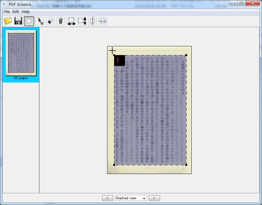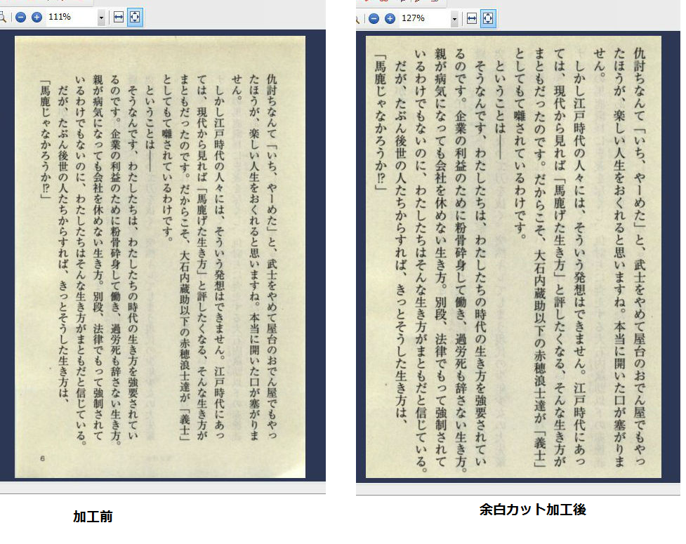 全ページの共通する余白部分を一発でカットできるソフトです。本・雑誌を電子書籍にして、iPad Kindle iPhoneなどの小さい画面では見にくい時などに、これで加工すると便利。